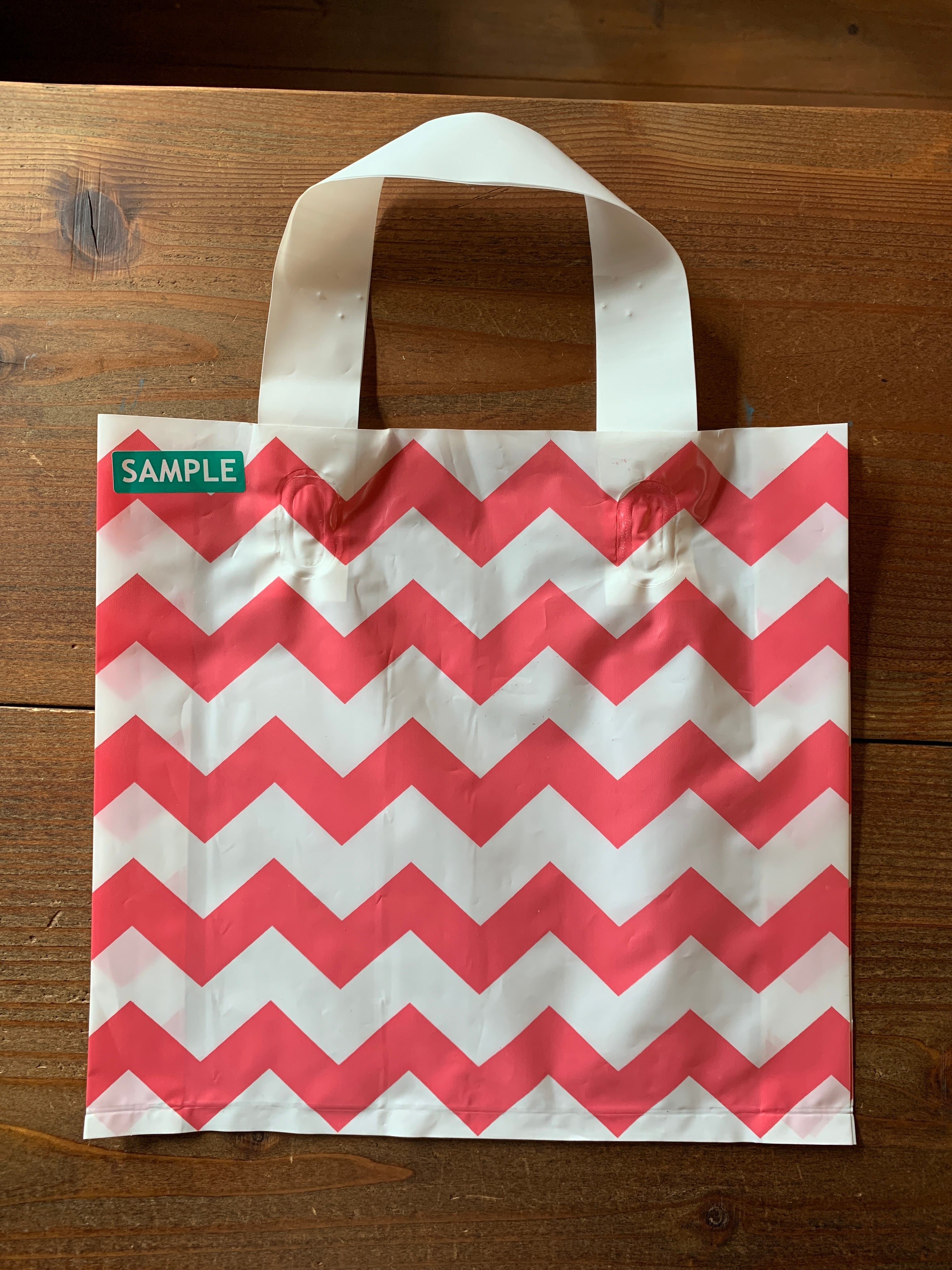 ジグザグ模様と発色の綺麗なピンクとグリーンの手提げビニール袋です。